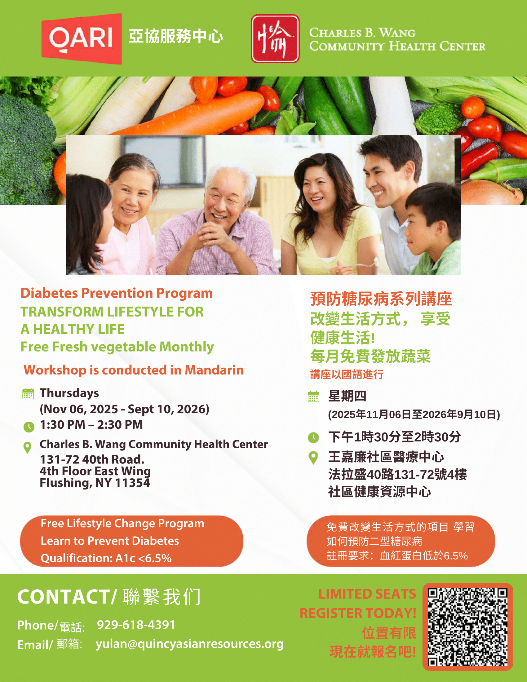 Program is available in Cantonese or Mandarin (based on participant language needs). To qualify interested candidates should be prediabetic (with A1c below 6.5) rather than already diagnosed with diabetes.